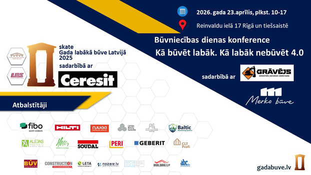 • Skates Gada labākā būve Latvijā rīkotāji aicina būvniecības nozares profesionāļus un interesentus piedalīties ikgadējā Būvniecības dienas konferencē Kā būvēt labāk. Kā labāk nebūvēt 4.0, kas notiks 2026. gada 23. aprīlī Rīgā.