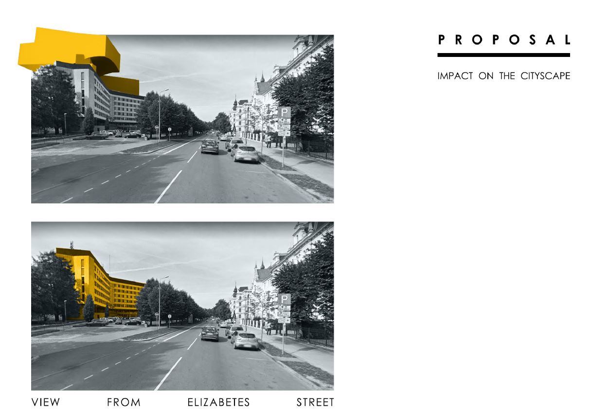Attēls Nr. 2: Scenārijs B – daļēji saglabāta Elizabetes 2 ēka ar jaunu koncertzāles apjomu virs esošās ēkas.