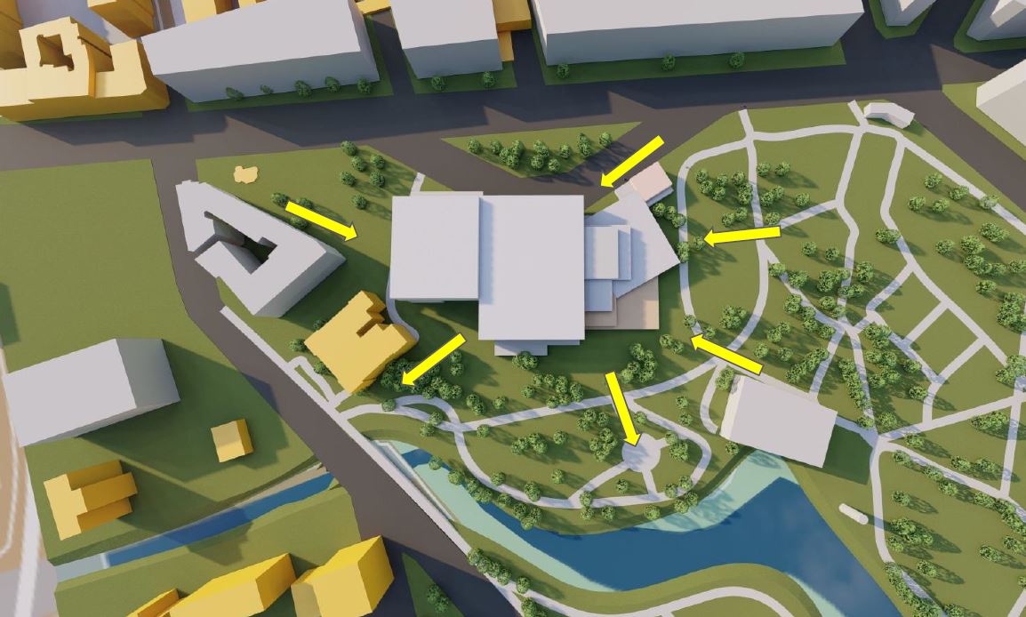 Attēls Nr. 1: Scenārijs A – Saglabātas Elizabetes 2 ēka ar jaunu koncertzāles apjomu blakus.