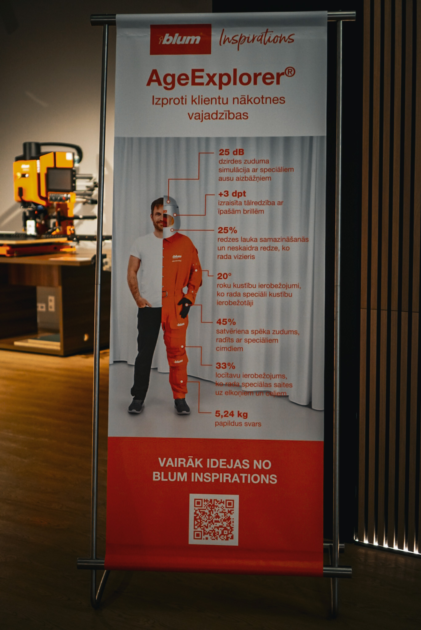 Pasākuma galvenais akcents būs Blum AgeExplorer® tērps – speciāls aprīkojums, kas ļauj izjust cilvēka ķermeņa kustību ierobežojumus vecumdienās vai ar funkcionāliem traucējumiem. Šī simulācija sniedz praktisku ieskatu tajā, kā plānot mēbeles tā, lai tās kalpotu komfortabli arī ilgtermiņā.