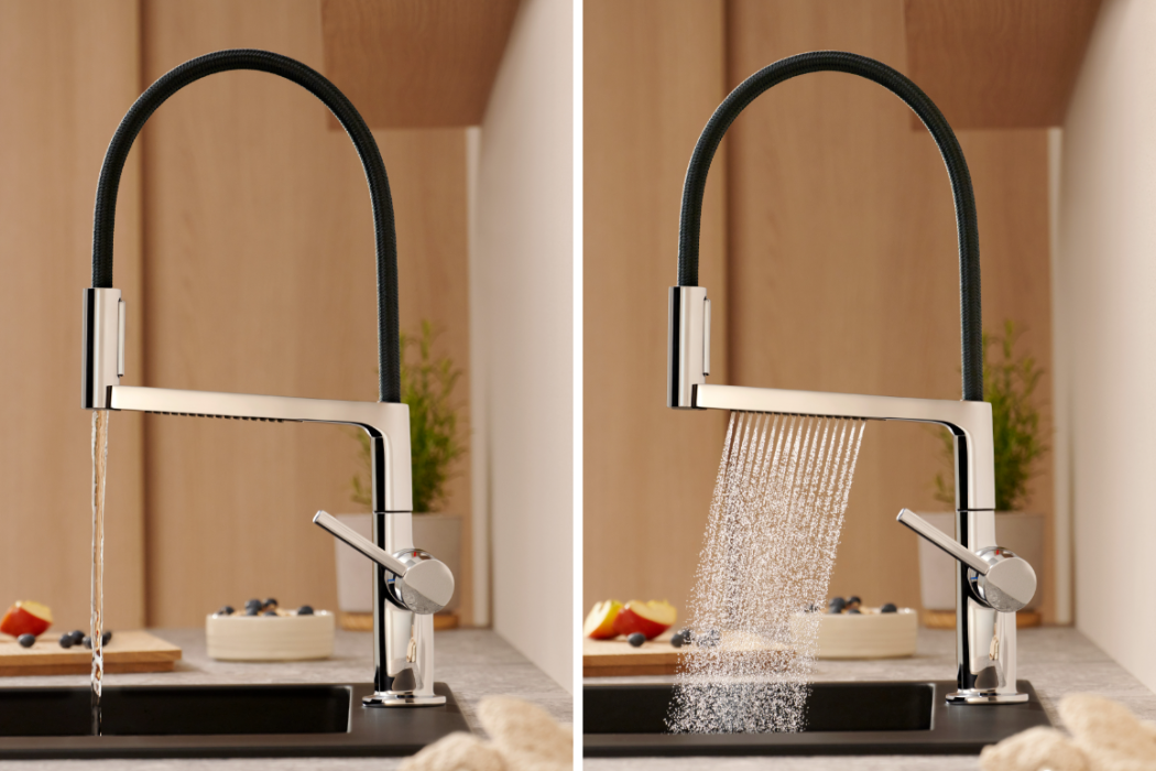 Jūs varat izmantot pulverizatoru PowderSpray ar zemu ūdens plūsmas strūklu vai dušas smidzinātāju ShowerSpray ar samazinātu ūdens strūklu. Abi ūdens strūklu veidi – gan PowderSpray, gan ShowerSpray – veidoti tā, lai ūdens plūsmas radītais spēks būtu “mīkstāks” un atsevišķi pilieni maigi nonāktu uz rokām, dārzeņiem vai citām virsmām. Tas palīdz izvairīties no šļakatām un līdz minimumam samazina kaļķakmens nogulsnes uz izlietnes.