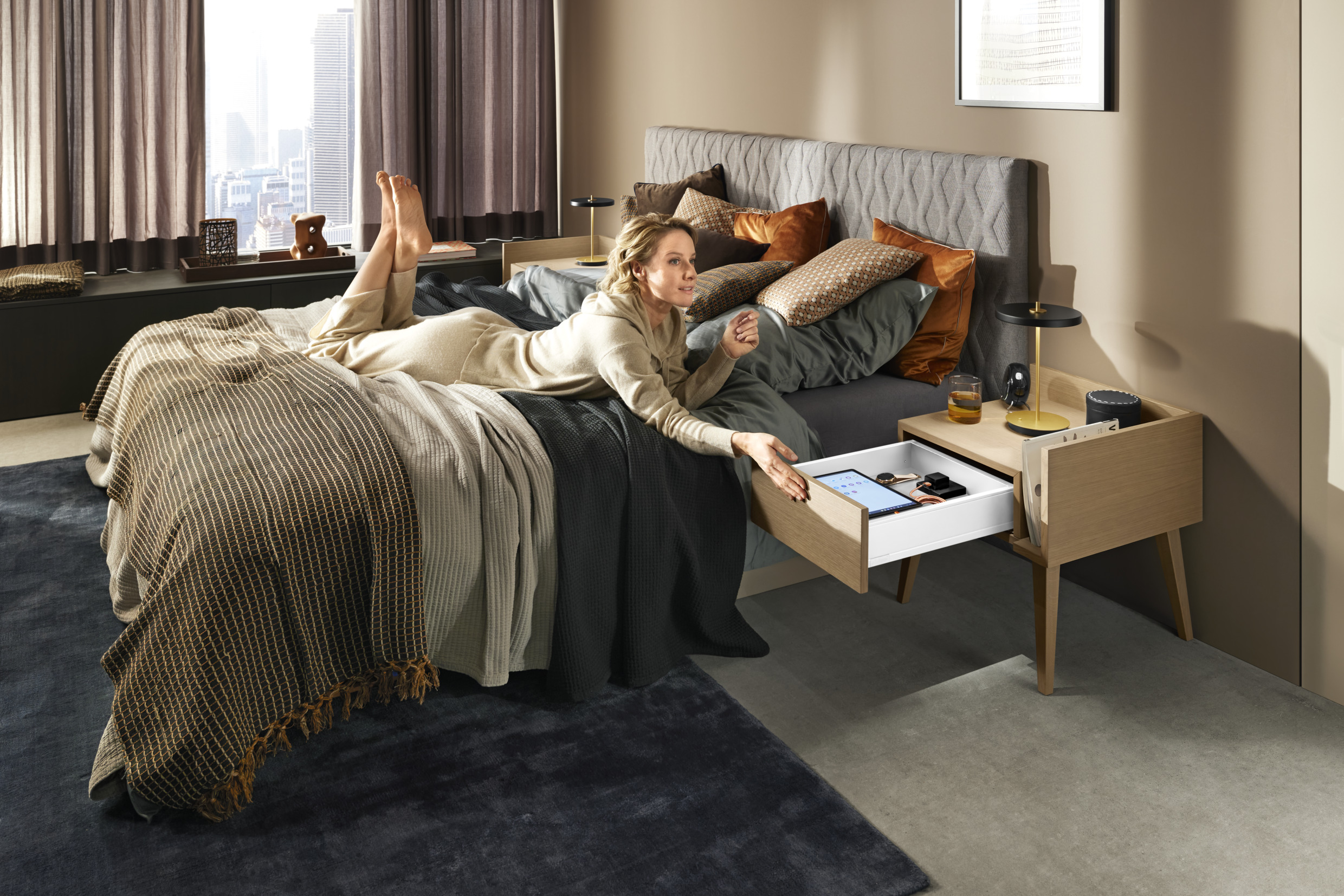 Guļamistabas skapītī izvietota rozete atvieglos mobilo ierīču un viedpulksteņu lādēšanu, un nepārslogos jau tā mazo virsmu gan vizuāli, gan funkcionāli.