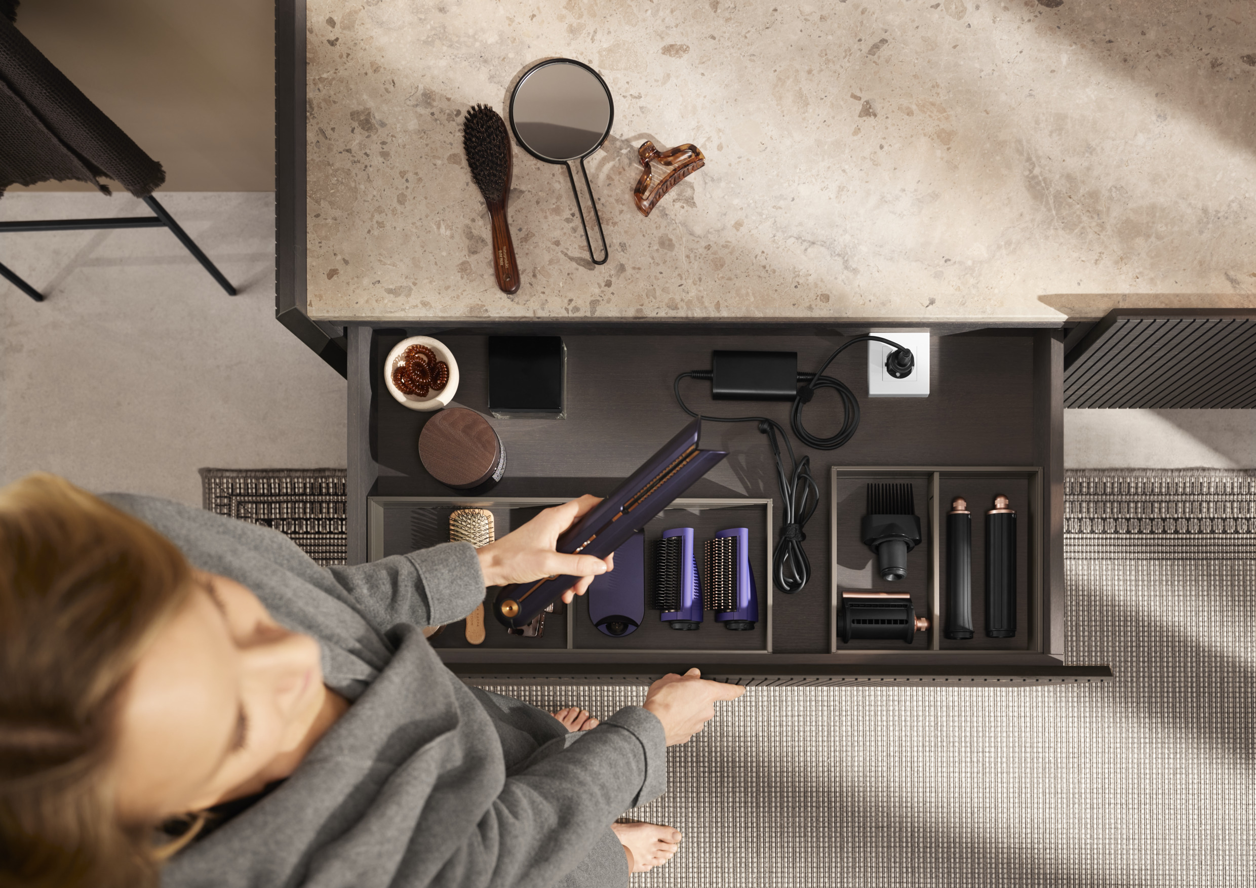 Atvilktnē izvietotajā rozetē pieslēdziet dažādus matu aksesuārus un izmantojiet to elektrisko skuvekļu un zobu biršu lādēšanai. Mazāk lieku vadu un aizņemtu darba virsmu.
