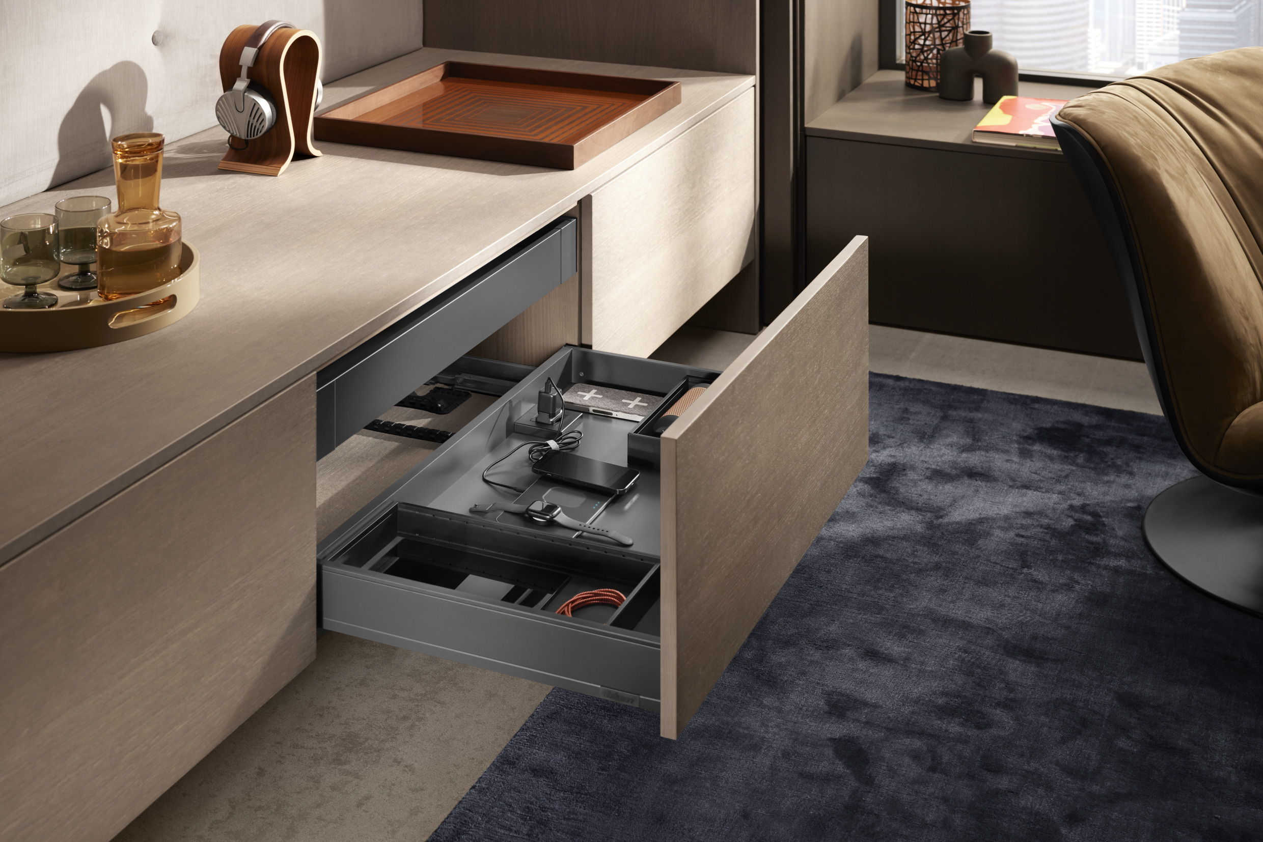 Atšķirībā no paštaisītiem risinājumiem, AMPEROS AC ideāli sader ar Blum risinājumiem un diskrēti iederas mēbeles konstrukcijā.