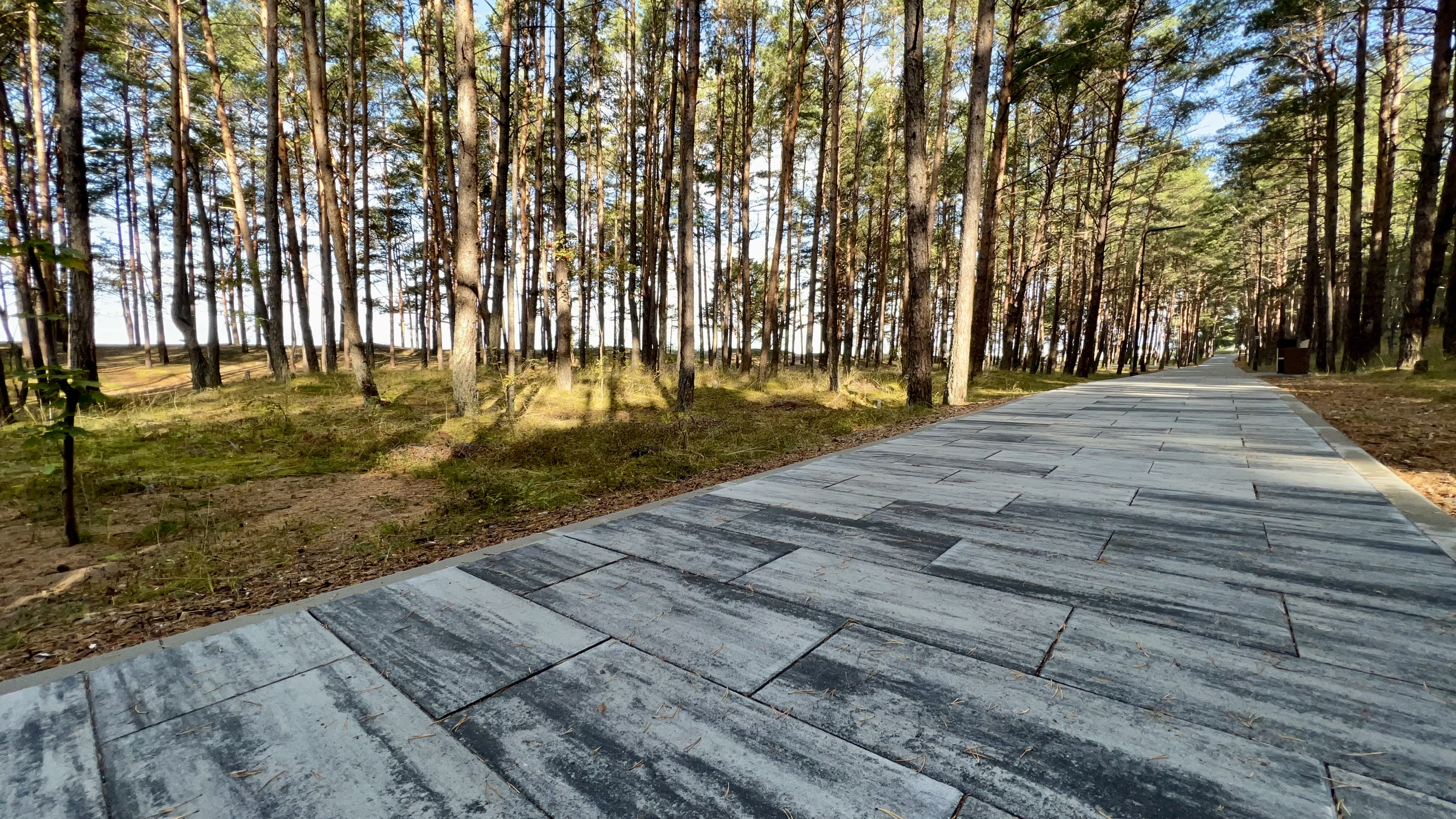 Trešais piemērs mūs aizved uz Saulkrastiem, kur gājēju ceļa izveidei izmantots arī Hansa 8 Mega, bet jau daudzkrāsainais jeb colormix krāsojums Granit tonī. Šajā tehnoloģijā vairāki saderīgi vai tieši kontrastējoši toņi tiek sajaukti jau ražošanas procesā, radot unikālu un neatkārtojamu krāsu rakstu uz katras plāksnes.
